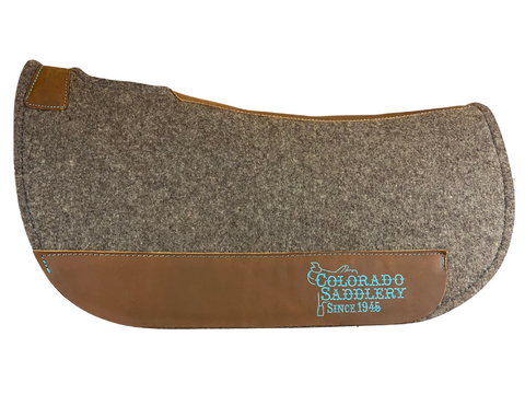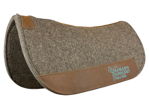 The Colorado Saddlery Round Saddle Pad is the top of the line. Horse experts generally agree that 100% natural wool is best for a horse's back. This pad is made out of thick, durable pressed wool, which not only protects the horse's back, but keeps the saddle in place. Wool also wicks away moisture from the horse's back and has cooling properties that help to regulate body temperature. The wither cut-out provides a heat reducing pressure release and is held together by top quality, secure leather. Wool saddle pads are also exceptionally easy to clean, and only get better over time as they form to the shape of the horse. The rounded shape is excellent for barrel racing, competition, or shorter backed horses.
