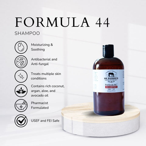 Formula 44 Shampoo is the newest addition to the Formula 44 product line, and the first step in treating your horse’s skin conditions. This medicated shampoo contains the same active ingredients as Formula 44 Ointment and Spray, including chlorhexidine, a trusted antibacterial and anti-fungal product used to treat scratches, mud fever, cannon crud, fungus, rain rot, fungus, itchy tails, and much more.