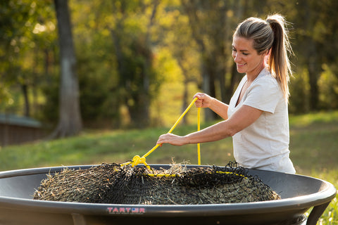 Tarter Equine Hay Basket sold separately. You can create the safest, healthiest, most cost effective square bale feeder on the market by pairing our slow feed hay net kit with a Tarter Equine Hay Basket (pictured and sold separately). The Texas Haynet slows consumption and helps prevent colic, ulcers, and founder. The Equine Hay Basket keeps hay dry and off the ground while allowing horses to eat in their natural position with their head down.